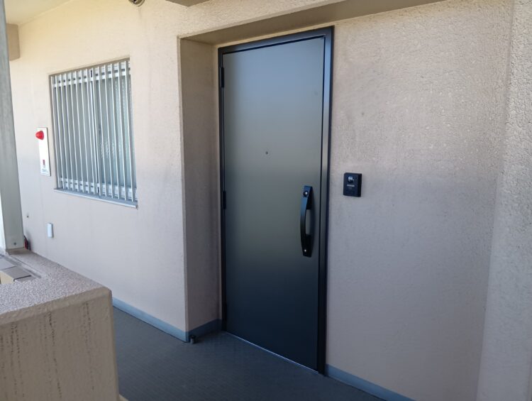 シンプルなデザインなので、賃貸入居者の好みに左右されず選ばれるドアになりました。レバーハンドルから、縦長のバーハンドルになり高級感が出ました。鍵は、ツーロックになったので、オートロックが無いマンションでも防犯面の心配が薄まります。シリンダーは、ピッキングに強いディンプルキーです。