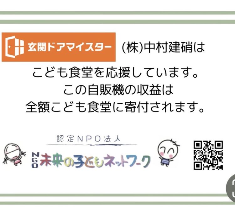 玄関ドアマイスターはこども食堂を応援しています。社長が10年前からボランティア参加している認定NPO未来の子どもネットワークさんに、利益を全額寄付できる自販機に変えました。