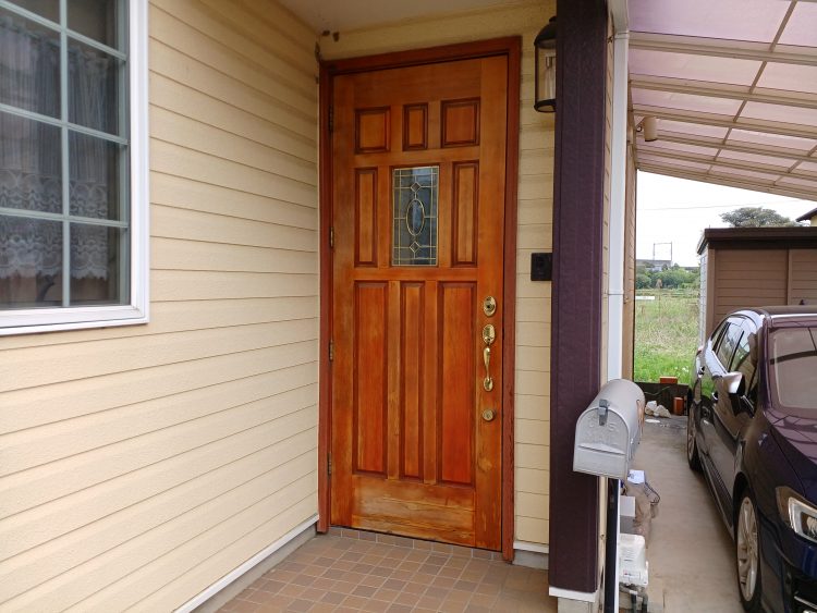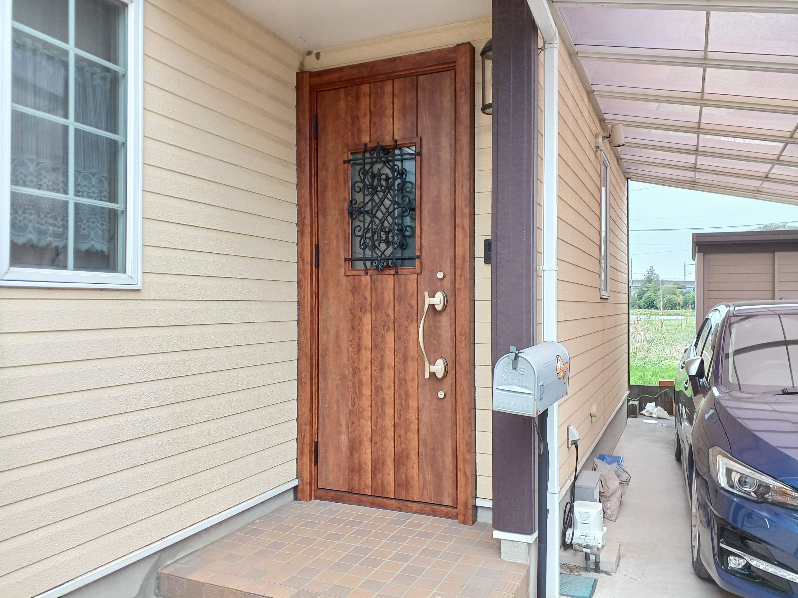輸入の木製玄関ドアがかなり劣化していました。塗装が傷み、カギもかかりにくくなっていました。木目調のLIXILリシェントで1日で交換ができます。建付けの問題も解決です。