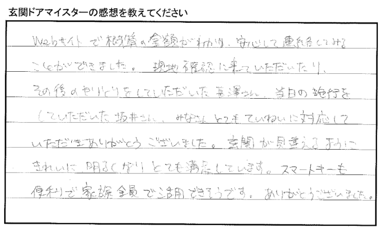 「玄関が見違えるようにきれいに明るくなりとても満足しています。スマートキーも便利で家族全員で活用できそうです。」