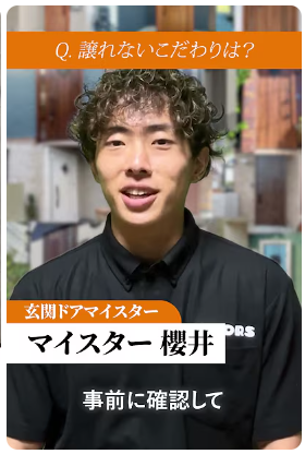 誰だかわからない人に室内に入られるのは不安ですよね?玄関ドアマイスターの工事は必ず自社の社員がお伺いします。社員はみんなホームページで顔を出して誇りをもって工事しています。