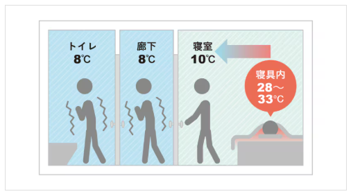 築年数の経った木造住宅では、暖房の効いた部屋と、トイレ・洗面所などの非暖房室との温度差が10度以上になることも珍しくありません。 この急激な温度変化が血圧を乱高下させ、心筋梗塞や脳卒中を引き起こす「ヒートショック」の原因となります。