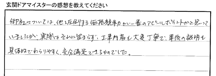 「御社については他を圧倒する価格競争力が一番のアピールポイントかと思っていましたが、実際はそれにとどまらず工事内容も大変丁寧で、事後の説明も具体的でわかりやすく充分満足できるものでした。」