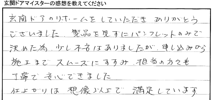 「製品を見ずにパンフレットのみで決めた為、少し不安はありましたが、申し込みから施工までスムーズにすすみ担当の方々も丁寧で安心できました。」