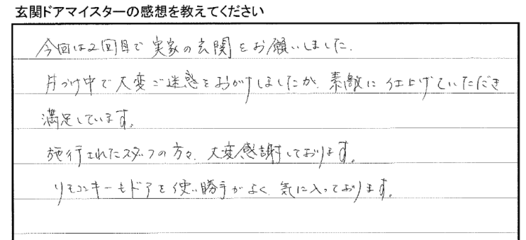 「片付け中で大変ご迷惑をおかけしましたが素敵に仕上げていただき満足しています。施工されたスタッフの方々、大変感謝しております。リモコンキーもドアも使い勝手がよく気に入っています。」
