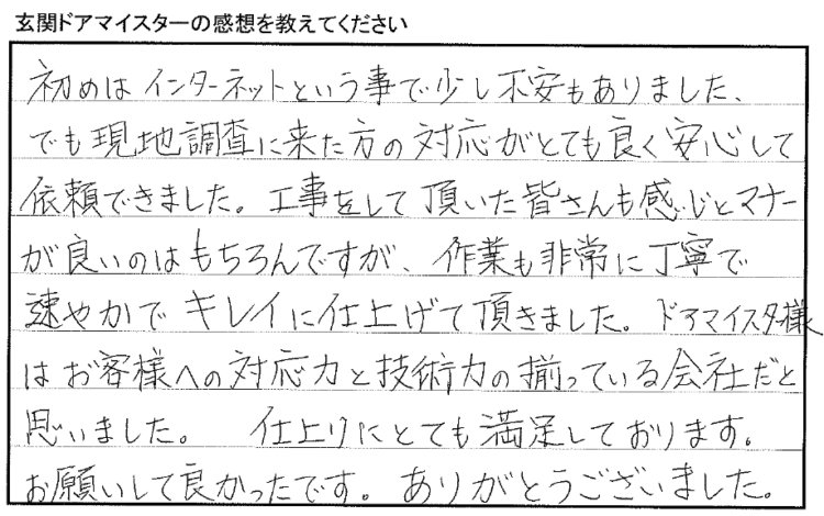 「ドアマイスター様は、お客様への対応力と技術力の揃っている会社だと思いました。仕上がりにとても満足しています。お願いして良かったです。」
