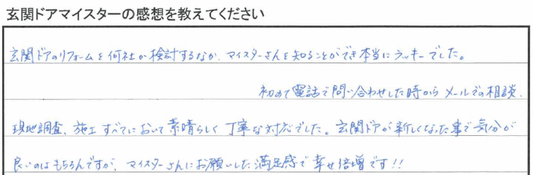 「玄関ドアが新しくなった事で気分が良いのはもちろんですが、マイスターさんにお願いした満足感で幸せ倍増です!! 周りの人にも積極的に薦めたいと思います。」