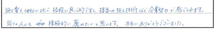 施工費も他社に比べ格段に良心的ですし、接客や施工技術など企業努力が感じられます。」