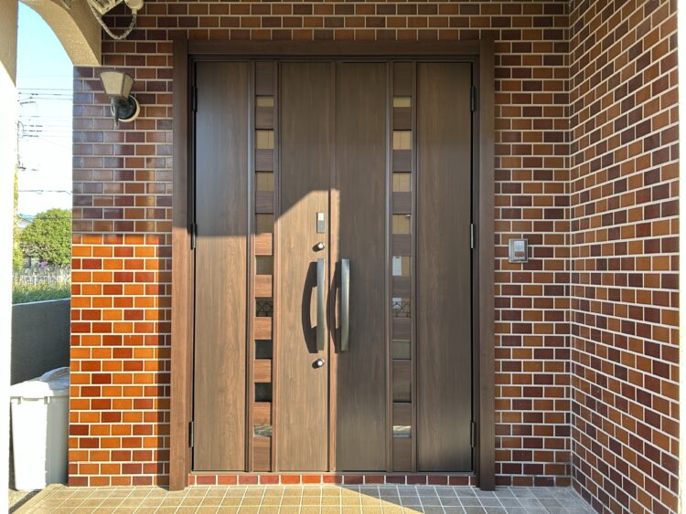 いかがでしょうか? 今回お選びいただいたのは、LIXILリシェント M28型。 元の両袖タイプ(真ん中のドアの両脇に固定ガラスがあるタイプ)から、左右の扉が開く「両開きドア」へとスタイルを変更しました。大きな荷物の搬入時など、開口部を広く使えるのがメリットです。 カラーは重厚感のある「クリエダーク」を採用し、築40年のお住まいにも馴染む落ち着いた雰囲気に仕上がりました。