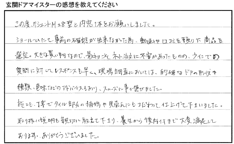 「大きな買い物なので、最初こそネット注文に不安があったものの、ラインでの質問に対してレスポンスも早く、現場調査においては、的確なドアの形状や種類、色味などのアドバイスもあり、スムーズに事が運びました。」
