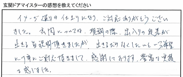 「玄関については、現調の際、出入りの段差が出来てしまう旨説明頂きましたが、出来るだけなくしたいという希望に丁寧にご対応頂きまして、感謝しております。豊富な実績を感じました。」