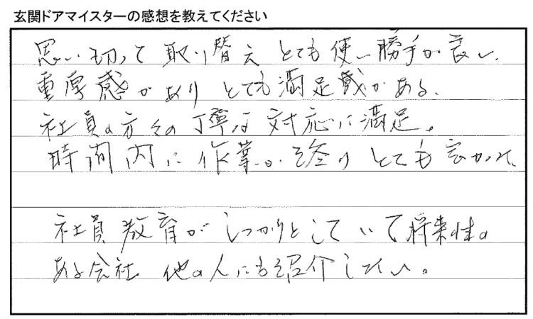 「思い切って取り換え、とても使い勝手が良い重厚感があり、とても満足感がある。社員の方々の丁寧な対応に満足。時間内に作業が終わりとても良かった。社員教育がしっかりとしていて将来性のある会社、他の人に紹介したい。」