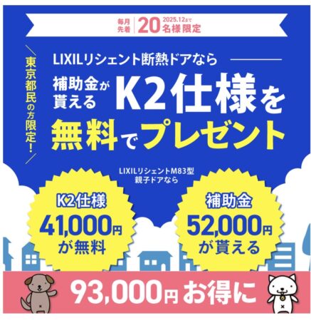 さらに今だけキャンペーン中です。助成金の対象になるのは高い断熱性能のドアだけなんですが、LIXILリシェントK2仕様にする増額分を玄関ドアマイスターが負担します。