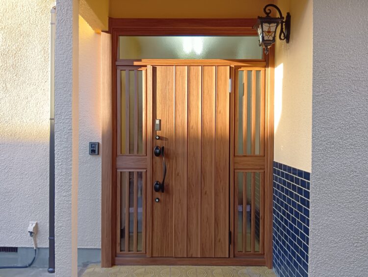 いかがでしょうか? 明るく高級感のある木目調カラー「チーク」と、引き締まった印象を与える「D型ブラック」のハンドルの組み合わせで、玄関周りがパッと華やかになりました。