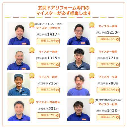 誰だかわからない人に室内に入られるのは不安ですよね?玄関ドアマイスターの工事は必ず自社の社員がお伺いします。社員はみんなホームページで顔を出して誇りをもって工事しています。