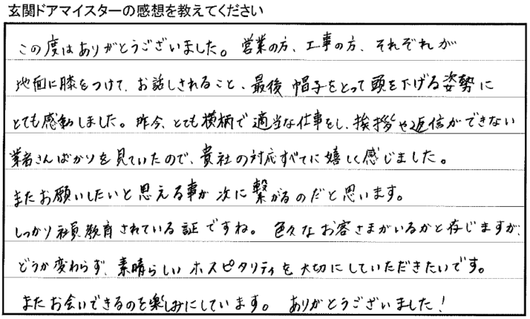 「この度はありがとうございました。営業の方、工事の方、それぞれが地面に膝をつけて、お話しされること、最後帽子をとって頭を下げる姿勢にとても感動しました。昨今、とても横柄で適当な仕事をし、挨拶や返信ができない業者さんばかりを見ていたので、貴社の対応すべてに嬉しく感じました。」