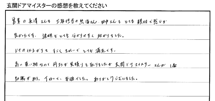 「営業の長澤さんも工事担当の熱海さん、田中さんもとても親切な感じが良かったです。 説明もとても分かりやすく助かりました。 ドアの仕上がりもすごくきれいでとても満足です。 高い買い物なので何社か見積もりを取りましたが、玄関ドアマイスターさんが一番知識があり、丁寧で安価でした。 ありがとうございました。」