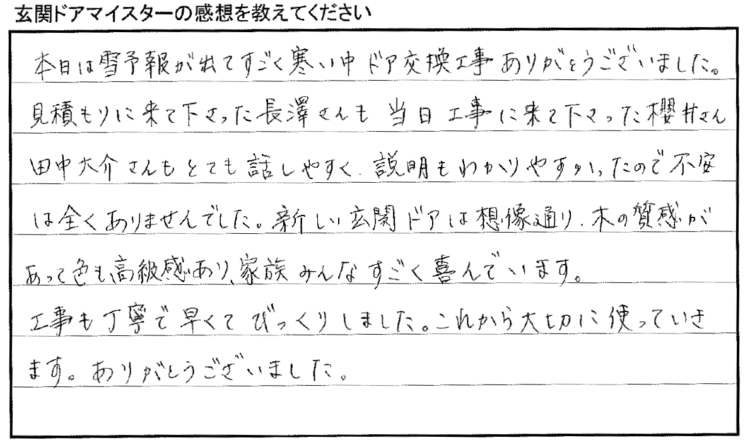 「本日は雪予報が出てすごく寒い中ドア交換工事ありがとうございました。 見積もりに来て下さった長澤さんも当日工事に来て下さった櫻井さん 田中大介さんもとても話しやすく、説明もわかりやすかったので不安は全くありませんでした。」