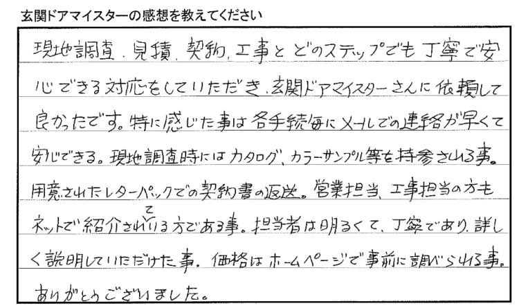 「現地調査、見積もり、契約、工事とどのステップでも丁寧で安心できる対応をしていただき、玄関ドアマイスターさんに依頼して良かったです。 特に感じたの事は、各手続ごとにメールでの連絡が速くて安心できる、現地調査時にはカタログ、カラーサンプル等を持参される事。用意されたレターパックでの契約書の返送。 営業担当、工事担当の方もネットで紹介されている方である事。担当者は明るくて丁寧であり詳しく説明して頂けた事。 価格はホームページで事前に調べられる事。ありがとうございました。」