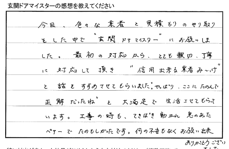 お客様からは、「今回、いろいろな業者と相見積もりのやり取りをした中で”玄関ドアマイスター”にお願いしました。最初の対応から、とても親切、丁寧に対応して頂き、”信用できる業者み~っけ”と話をすすめさせてもらいました。”やっぱりここに頼んで正解だったね”と大満足で生活させてもらっています。工事の時もてきぱき動かれ息の合ったペアーで頼もしかったです。何の不安もなくお願い出来ありがとうございました。」と大変ご満足いただきました。