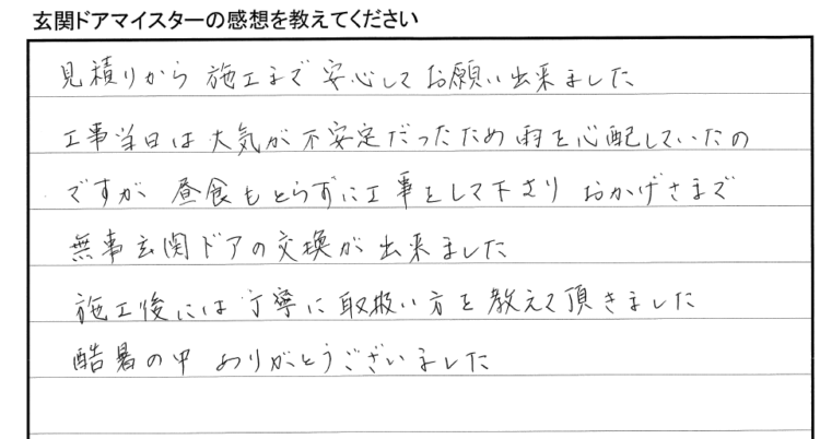 「見積もりから施工まで安心してお任せできました。工事当日は大気が不安定だったため雨を心配していたのですが、昼食も取らずに工事をしてくださり、おかげさまで無事玄関ドアの交換ができました。施工後にはていねいに取り扱い方を教えていただきました。酷暑の中ありがとうございました。」