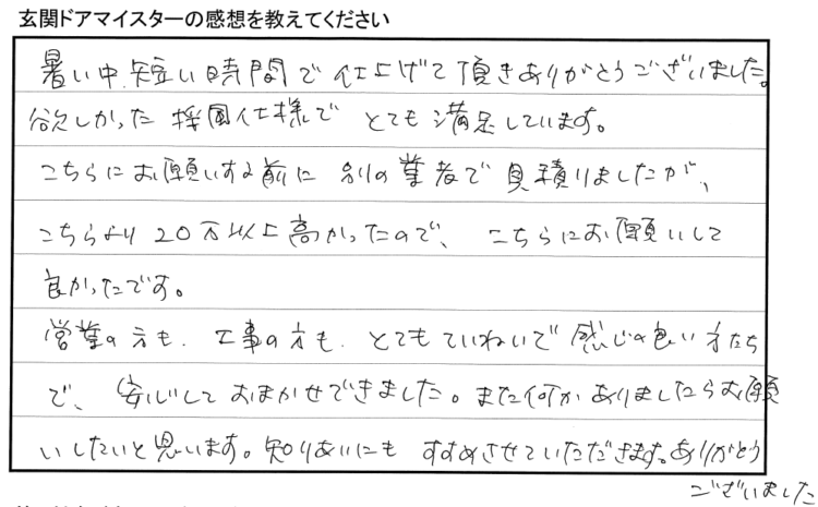 「暑い中短い時間で仕上げていただきありがとうございました。欲しかった採風仕様でとても満足しています。 こちらにお願いする前に別の業者で見積もりしましたが、こちらより20万円以上高かったので、こちらにお願いしてよかったです。 営業の方も、工事の方もとてもていねいで感じの良い方たちで、安心してお任せできました。 また何かありましたらお願いしたいと思います。知り合いにもすすめさせていただきます。ありがとうございました!」