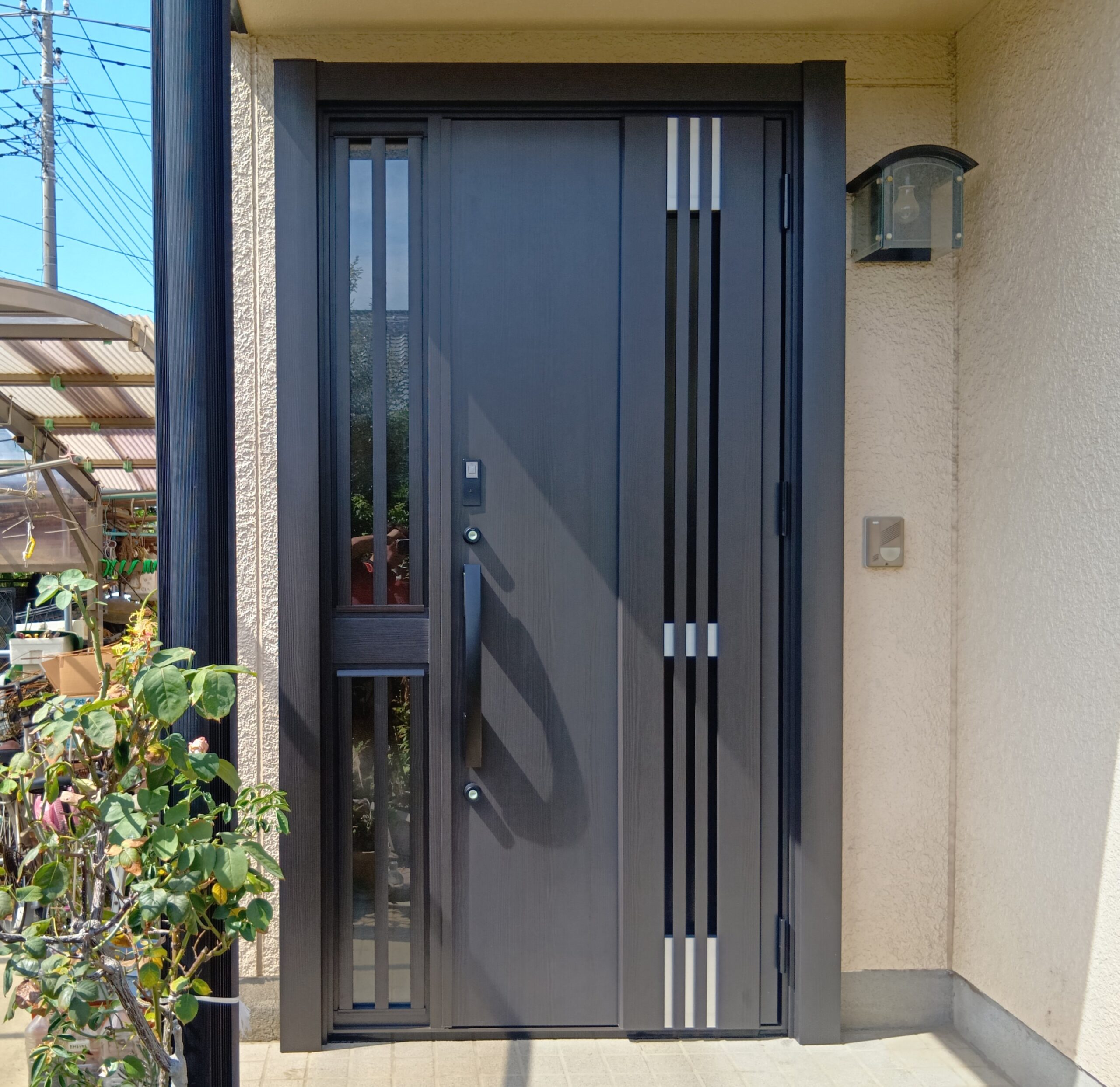 いかがでしょうか? リフォーム前のドアは親子ドアでしたが、新しいドアは片袖枠のドアで室内に明かりをたっぷり取り入れられます。