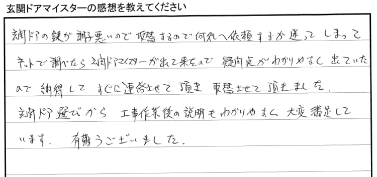 「玄関ドアの鍵が調子悪いので取替するので何処へ依頼するか迷ってしまって、ネットで調べたら玄関ドアマイスターが出てきたので疑問点が分かりやすく出ていたので納得してすぐに連絡させて頂き取替させて頂きました。」