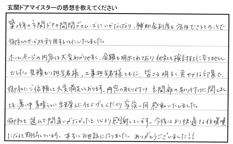 (中略)玄関扉の取り付けに関しても暑い中素晴らしい出来栄えに仕上げてくださり家族一同感動いたしました。御社を選んで間違いがなかったと心より感謝しています。今後はより快適な住環境になると期待しています。本当にお世話になりました。ありがとうございました!!」