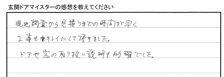そして最大の強みは、すべての工事を下請け業者に任せず、経験豊富な自社の「マイスター」が行うことです。毎日、ドアと窓に触れている専門家だからこそできる、高い技術力と丁寧な対応、美しい養生でお客様に満足をお届けします。