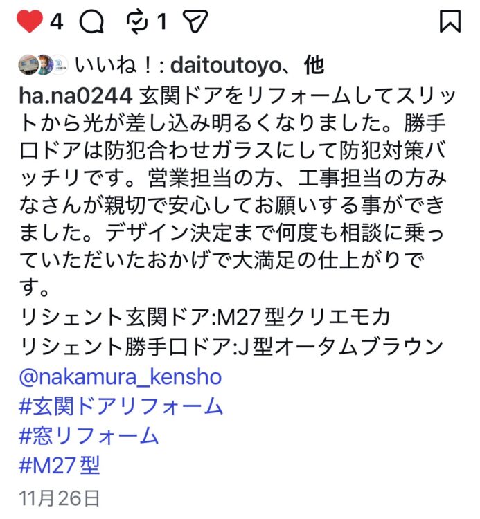 今月も素晴らしい投稿をありがとうございました。Instagramの投稿は少なめなのでベスト投稿のチャンスです。これからも皆様に玄関ドアマイスターにしてよかったと思っていただける対応に努めてまいります