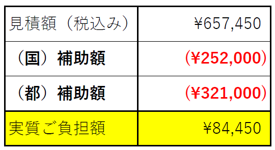 ご覧の通り、当社の2026年3月時点のお見積金額657,450円に対し、国と東京都の二つの補助金が合計で573,000円出るので、実質84,450円で工事できてしまいます。