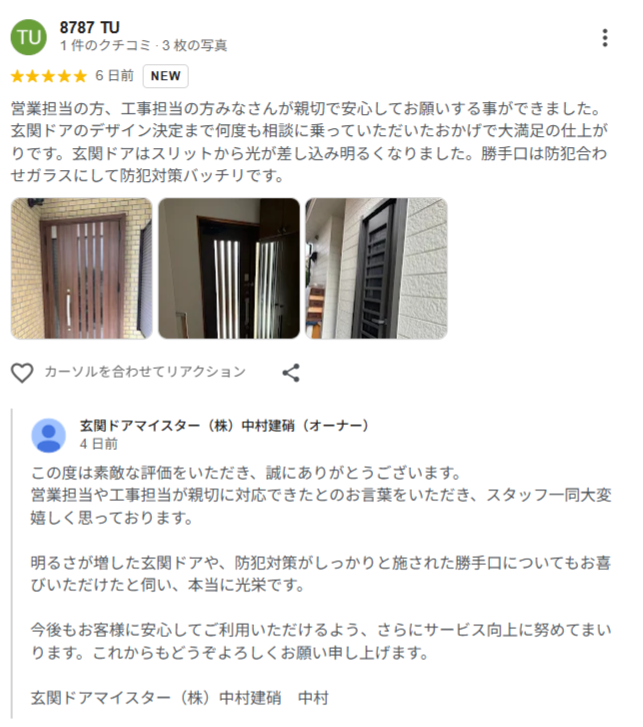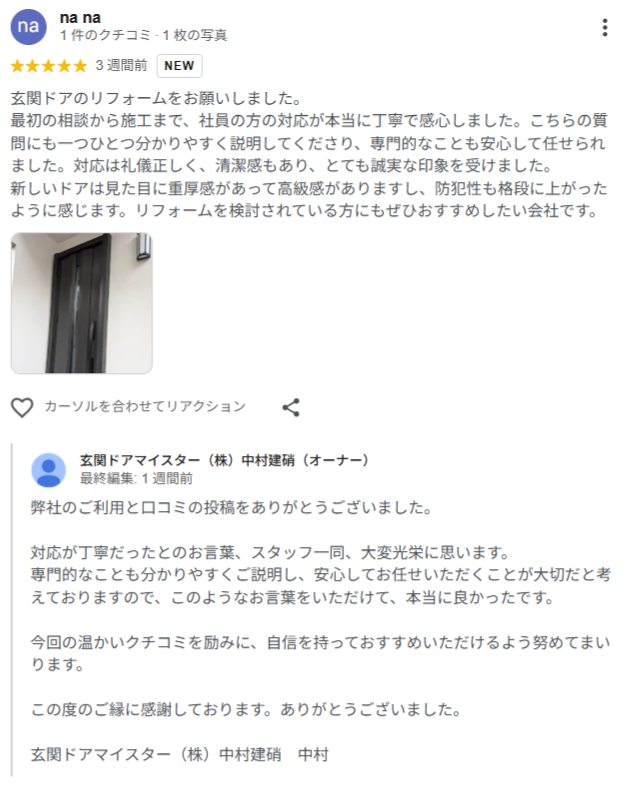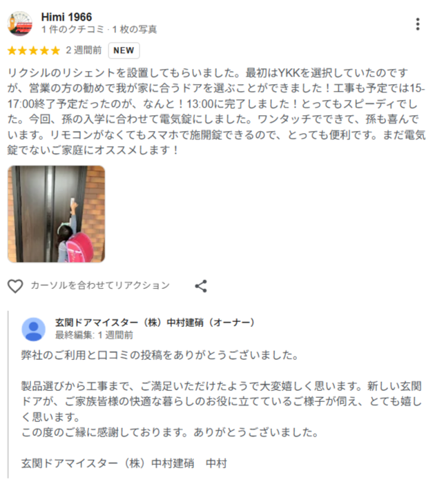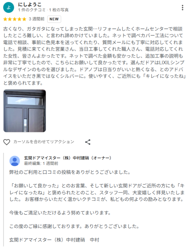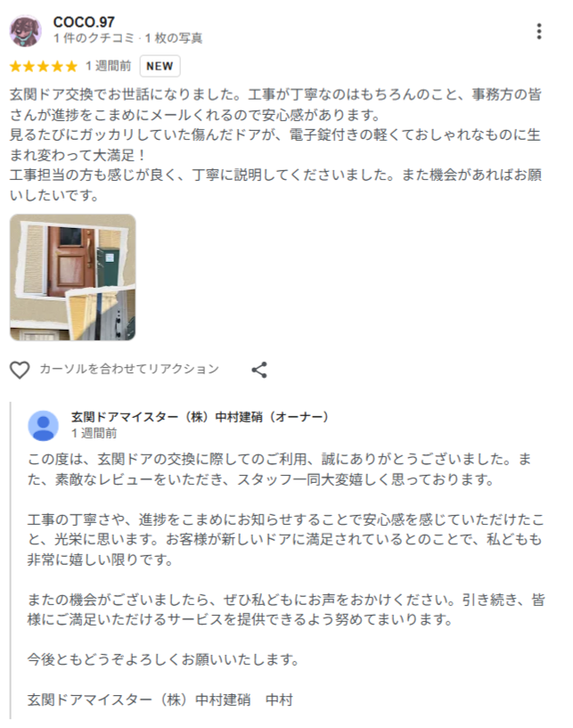 玄関ドア交換でお世話になりました。工事が丁寧なのはもちろんのこと、事務方の皆さんが進捗をこまめにメールくれるので安心感があります。