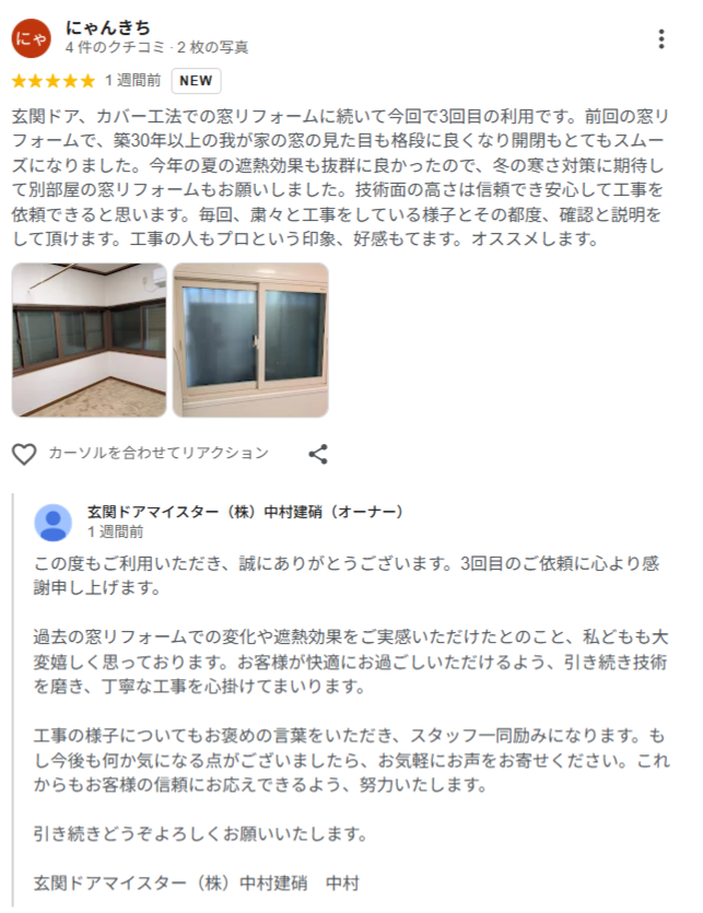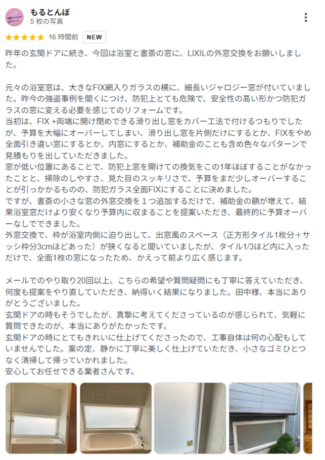 YouTubeを見て知り、内窓15箇所と、玄関ドアと勝手口ドアの交換を依頼しました。わかりやすい説明と、作業段取りの良さと、仕上がりの良さで、大満足です。