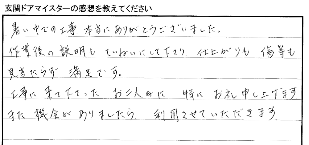 「暑い中での工事、本当にありがとうございました。」 「仕上がりも傷等も見当たらず満足です。」