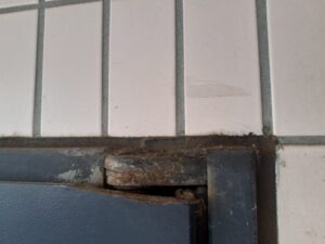 丁番がサビて動かないせいでドアまで変形しています。こうなると修理は不可能なのでドア交換工事になります。
