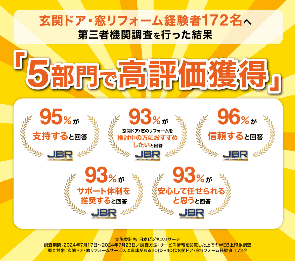 なぜこのような完全保証ができるかというと、玄関ドアマイスターは自社の工事に責任を持っているからです。窓とドアの専門店として数多くの工事と補助金申請をしてまいりました。そのため当社は、審査が通る工事の完全実施、補助金の確かなご案内ができるため、補助金額の完全保証が出来ています。