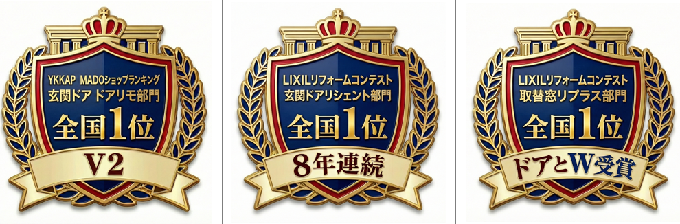 「全国1位」を合計11回受賞の圧倒的技術力 おかげさまで、メーカー主催コンテストにおいて、玄関ドア「LIXILリシェント」「YKKAPドアリモ」、窓交換「LIXILリプラス」の部門で、全国1位を合計11回受賞しております。毎日ドアと窓のリフォームを自社マイスターが行い、2025年は1,300本以上の工事を完遂いたしました。