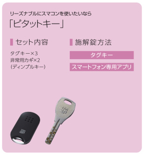 最大のポイントは、電池式電気錠の「ピタットキー」です。タグキーが3個付属しており、ドアをボタンを押してタグを近づけるだけでカギの開け閉めができます。さらにはお手持ちのスマートフォンに無料のアプリを入れて、リモコンキーのように利用することも可能。毎日のドアの開け閉めが劇的にスムーズになります。