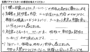 「来宅者の3名ともに、マナーが良く、明朗で取付後の説明もていねいで、わかりやすかったです。」 「今回は、玄関ドアマイスターさんに依頼して◎という思いです。」