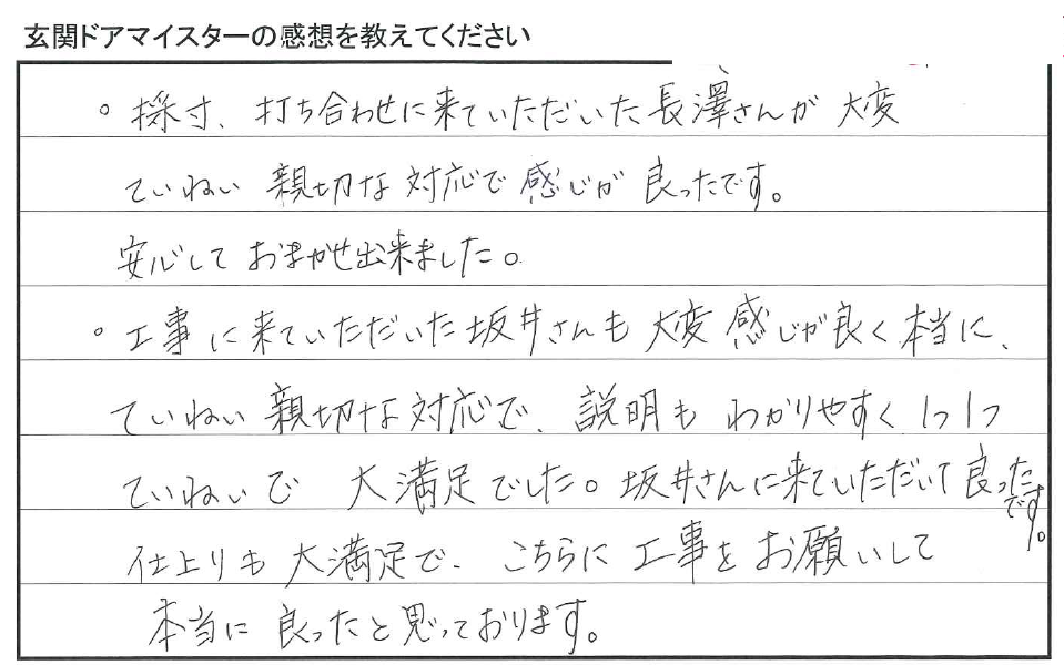 「工事に来ていただいた坂井さんも大変感じが良く本当に、ていねい 親切な対応で、説明もわかりやすく1つ1つていねいで大満足でした。坂井さんに来ていただいて良かったです。仕上りも大満足で、こちらに工事をお願いして本当に良かったと思っております。」