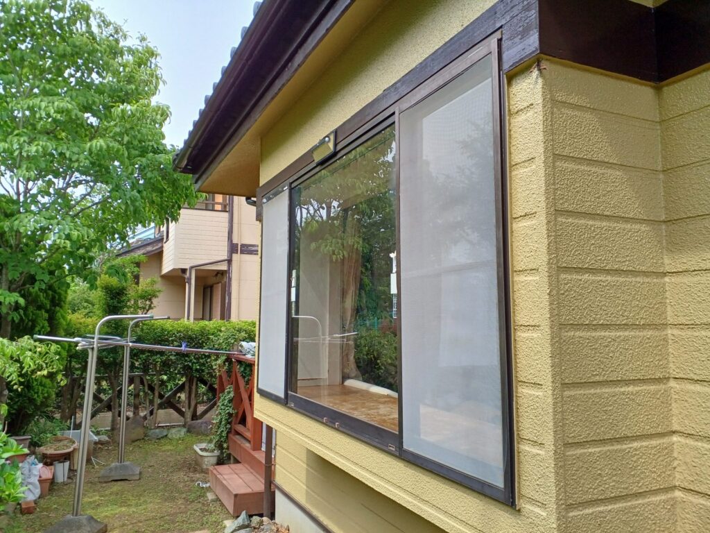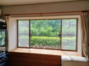 元の窓は昔ながら単板ガラスで断熱性能は極めて低く、夏は暑さが窓から入り込み、冬は窓から冷気が落ちてくる状況でした。お庭の眺望が素敵な窓なので、格子や雨戸を取り付けたくない窓です。今回は、防犯機能もある防犯合わせガス入りLowE複層ガラスが入ったアルミ樹脂複合窓のLIXILリプラスで、窓を交換させていただきました。外側はブラックで引き締まった印象になりました。内側はクリエラスクで柔らかな印象の窓になりました。網戸の網は汚れにくいきれいネットです。網の色はブラックなので網戸の存在が外から目立たなくなりました。