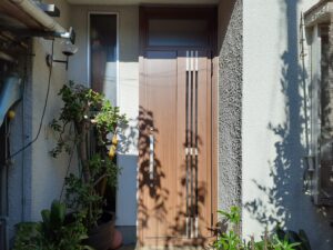 40年以上使用した木製の玄関ドアからのリフォームでした。ドアの横の窓ははめ殺しで開かない窓なので、換気ができない事にお悩みのお客様でした。風が通せる断熱ドアのリシェントM83型でリフォームした換気のお悩みを解決。木目調のカラーなので、元の木製ドアからの違和感もなくたいへん喜んでいただけました。