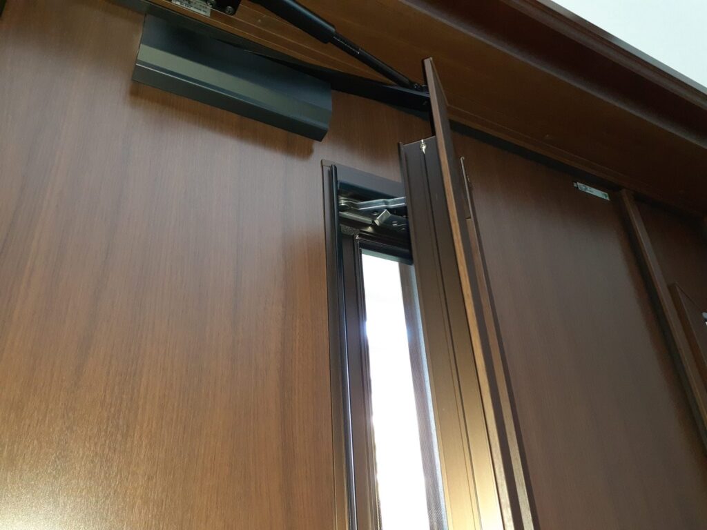 ドア中央の細いガラス部分が開けられるドアです。写真では分かりませんが網戸の網が付いています。