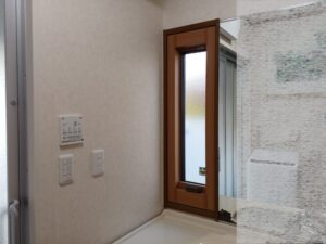 押して開けるタイプの洗面所の窓を断熱リフォームします。