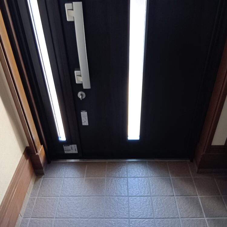 外壁を塗装したら古い玄関ドアが気になるようになってしまったそうです。また、防犯面でも古いドアは心配とのことで最新のドアにリフォームをご希望でした。