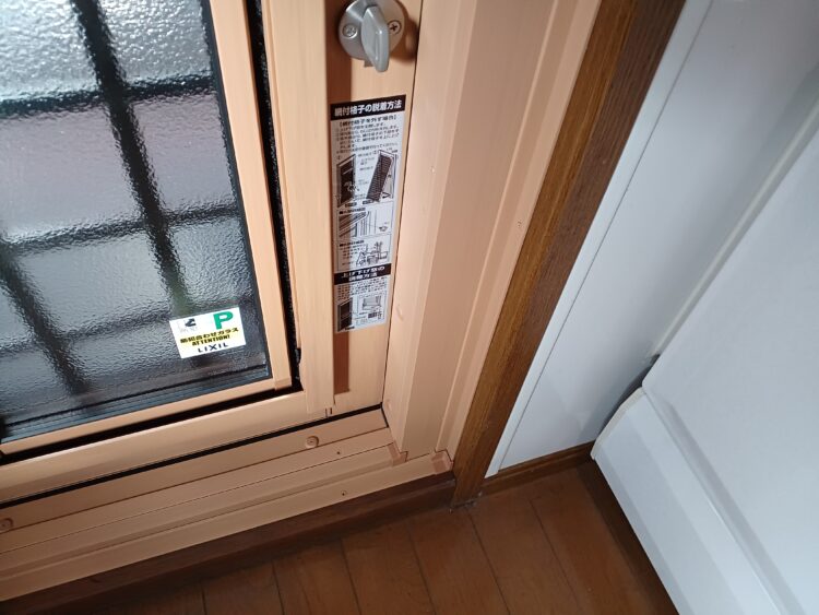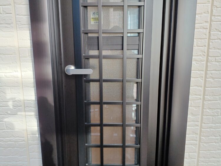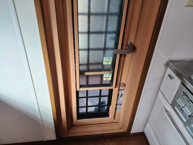 工事前の勝手口ドアは、ガラス面に格子がなく、カギは1か所と防犯面での不安がありました。また、枠はアルミでガラスはシングルガラスと断熱性も低く、冬場の冷気の侵入経路になりがちでした。