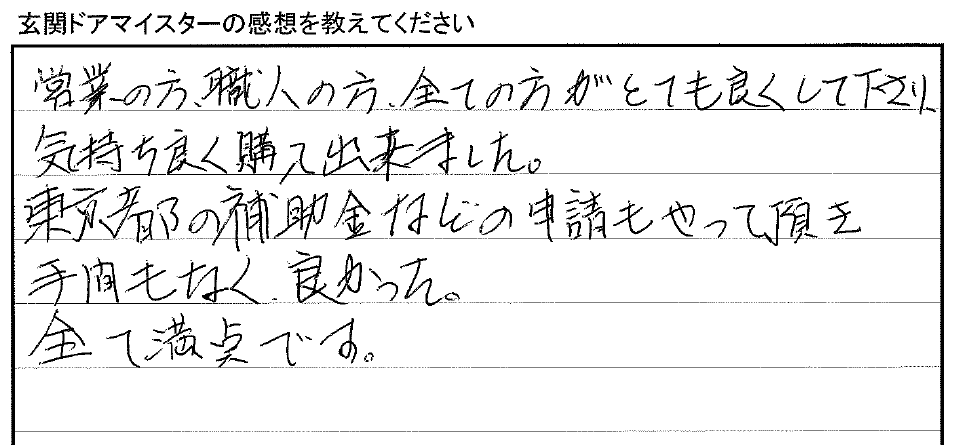 「東京都の補助金などの申請もやって頂き、手間もなく良かった。すべて満点です。」