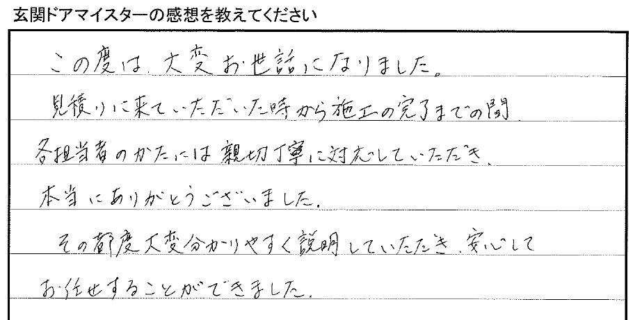「見積もりに来ていただいた時から施工の完了までの間、各担当者の方には親切丁寧に対応していただき、本当にありがとうございました。」
