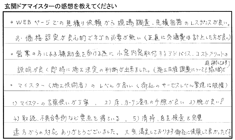 「マイスター(施工技術者)のレベルが高い(御社のサービスレベル管理に脱帽)。マイスターの言葉使いが丁寧。床、カーテン養生の手際が良い。腕が良い!」